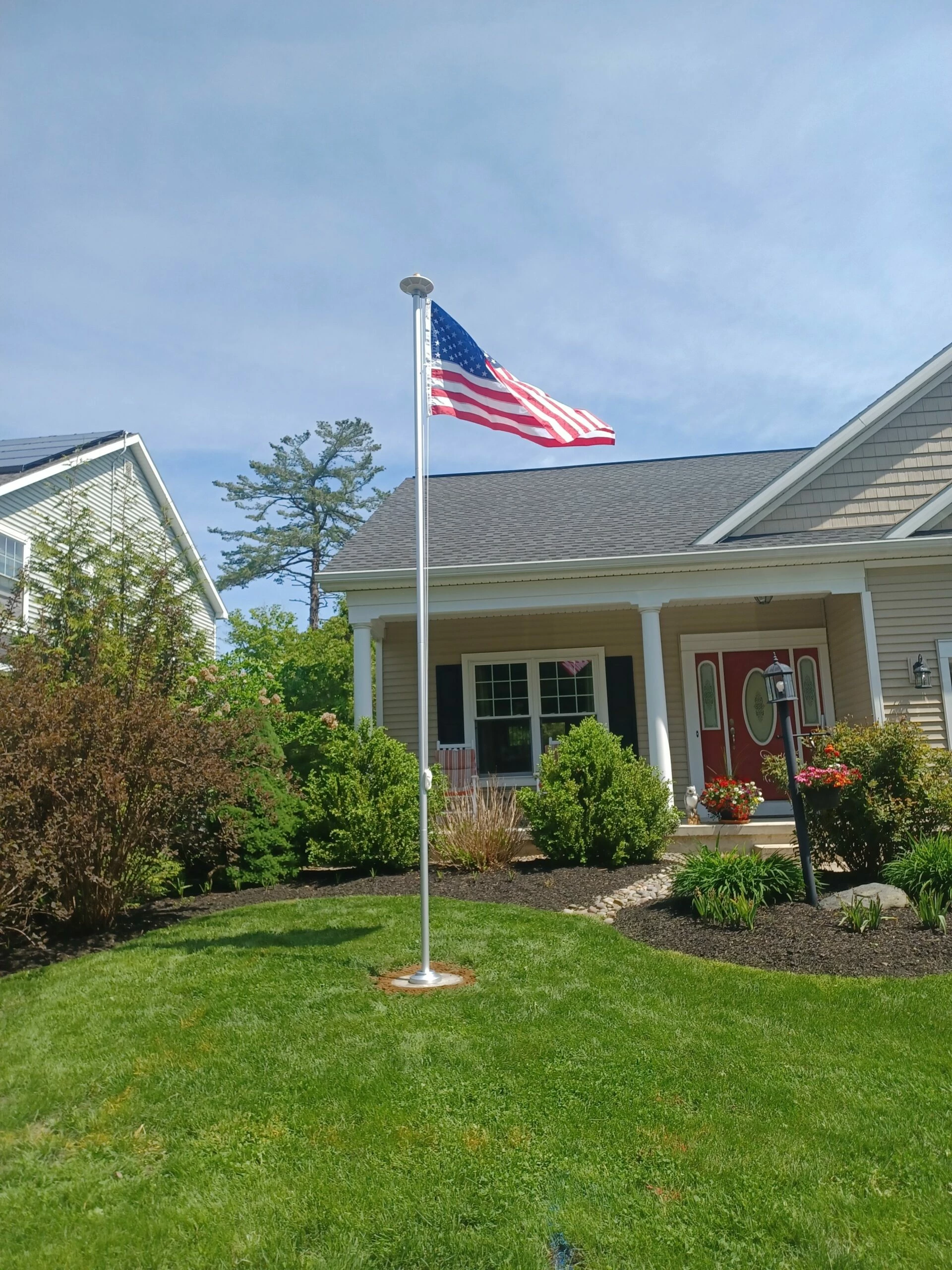 This 20′ aluminum flagpole kit comes with 5 sections of 2″ aluminum tubing that slides together to become a 20′ display.