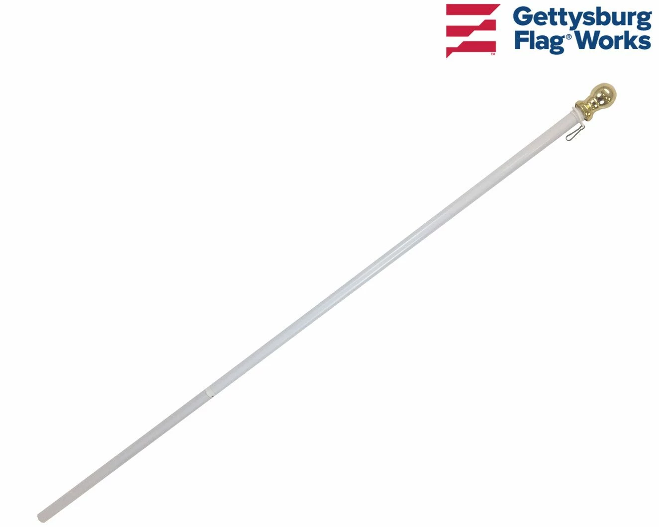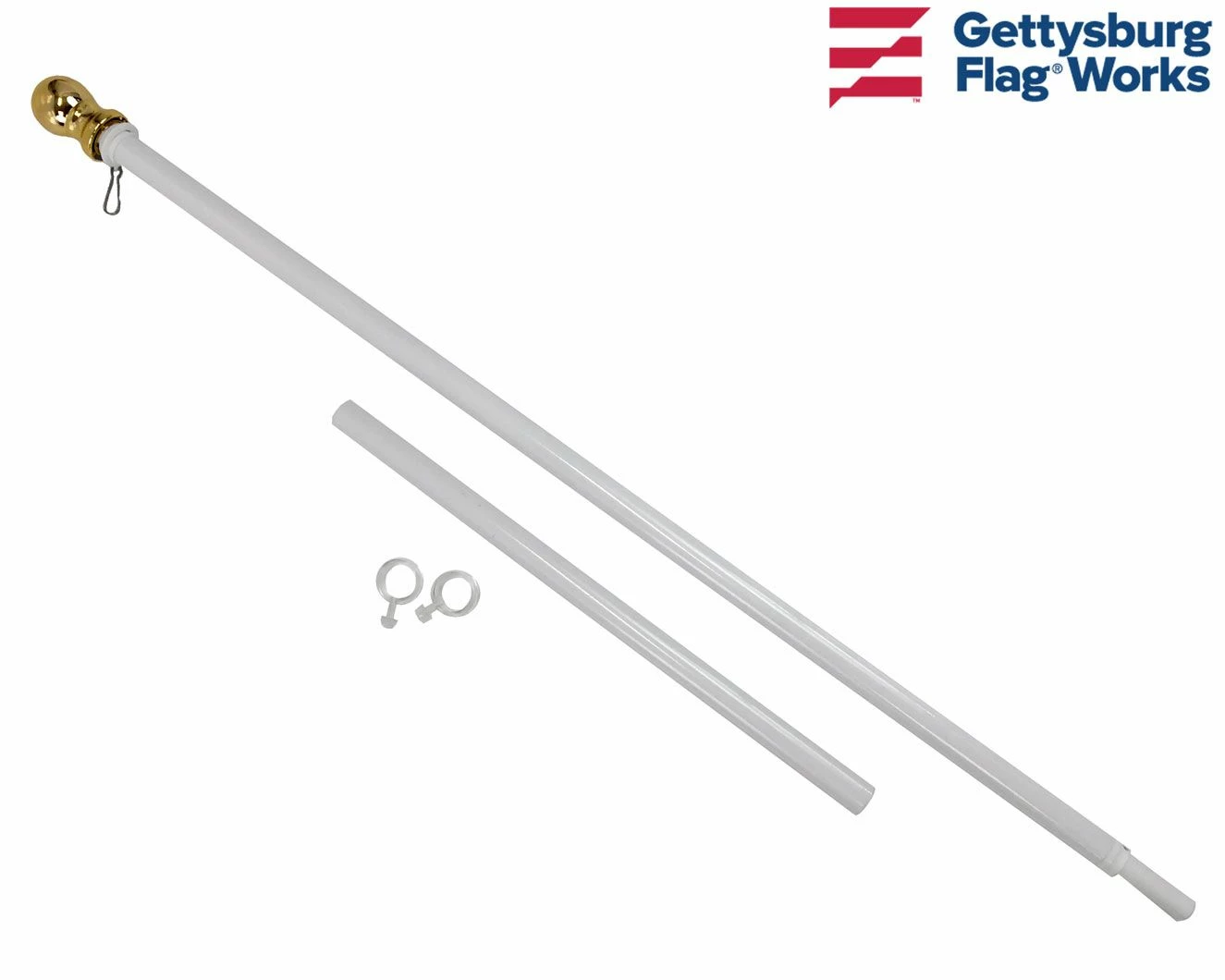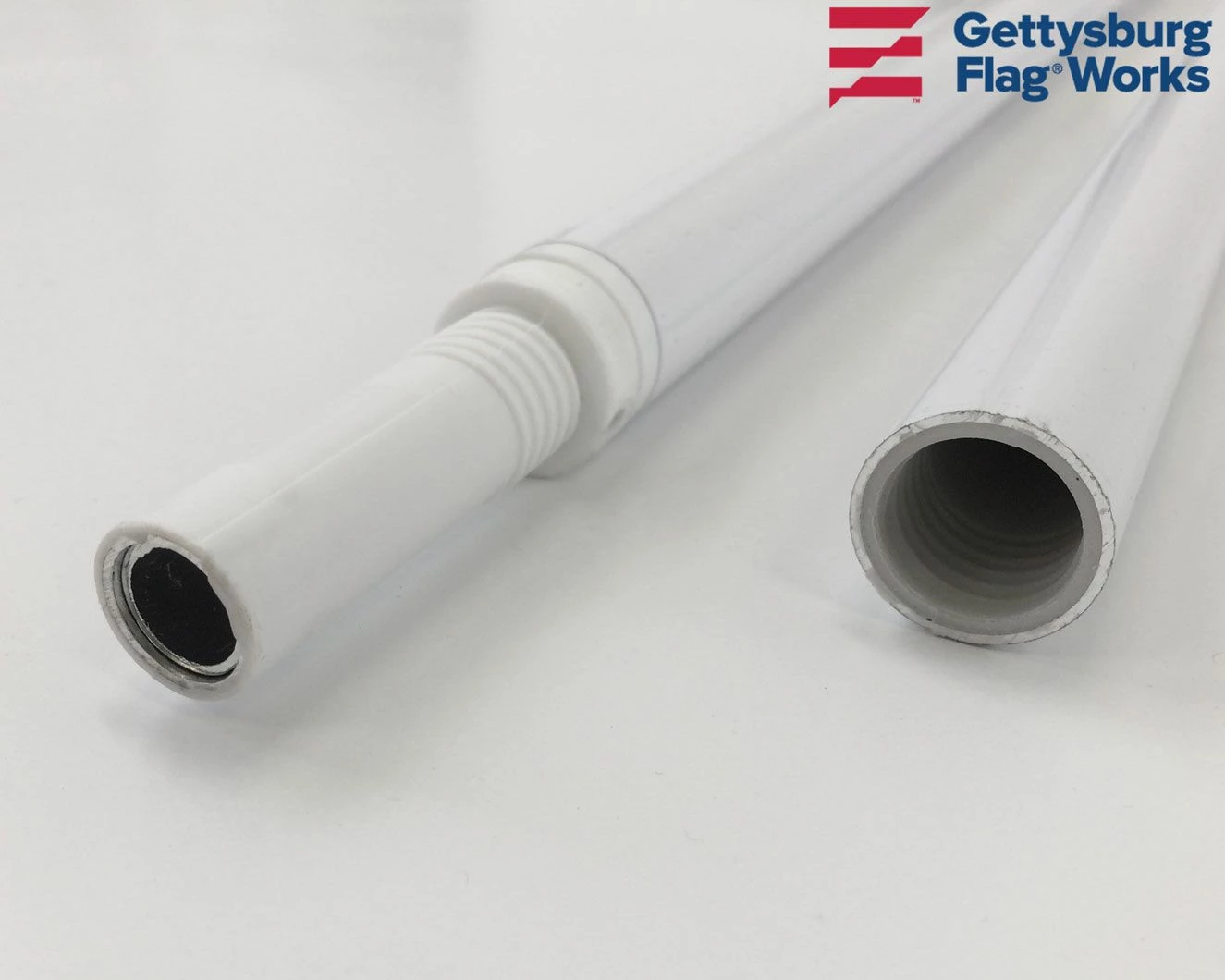 This oversized white painted aluminum, two piece rotating pole is your ultimate choice for a display pole. Perfect for tailgating, sports events or other temporary display of a flag. For the easiest and most versatile installation, this pole comes with two flag fasteners for flying a grommeted flag and also with a snap and swivel ring for displaying banners with a pole sleeve and tab. Flag not included. Maximum flag size is 3×5.’
