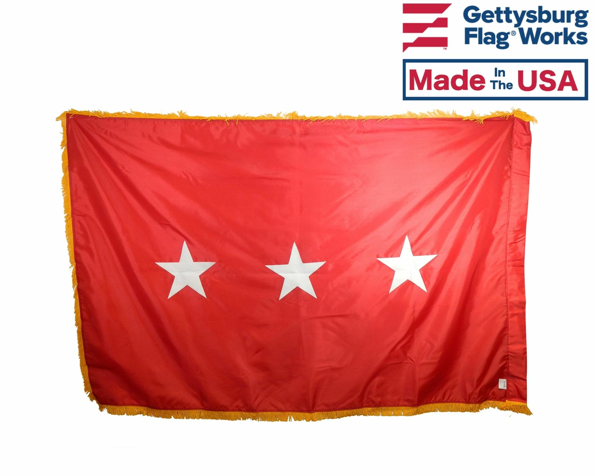 White applique (sewn) stars on red background with ornamental pole hem and fringe for formal use . Please contact us for pricing on other sizes or types of mounting.
