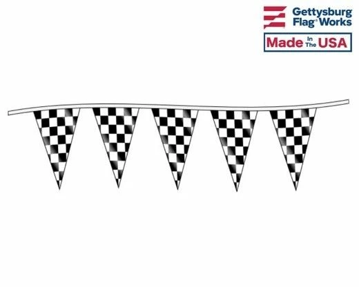 Gentleman, start your engines! 4 Mil polyethylene plastic, 12×18″ triangle pennants mounted and double-stitched on durable plastic-covered ropes.