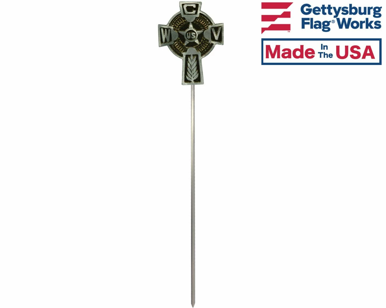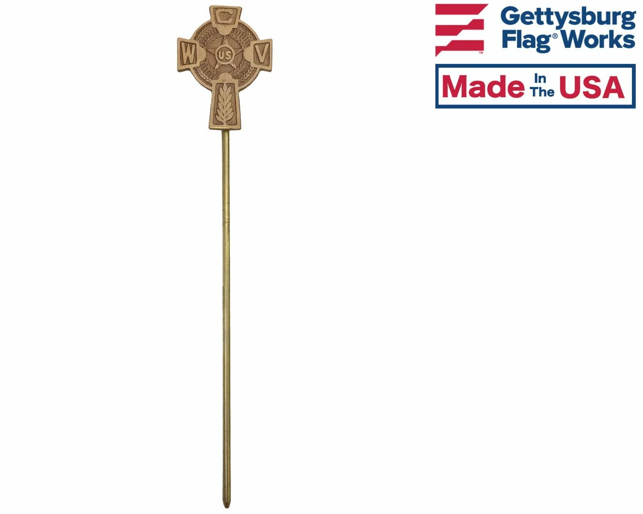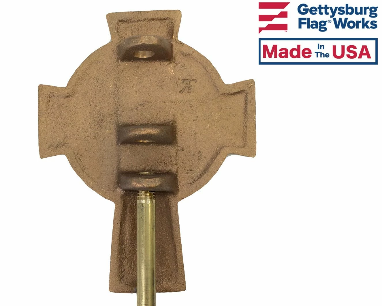 Christian war veteran grave marker. Cross design. Official design mounted on 21″ brass rod, holds one 12×18″ stick flag on a 3/8″ staff. Choose between cast bronze or bronze-finished aluminum.