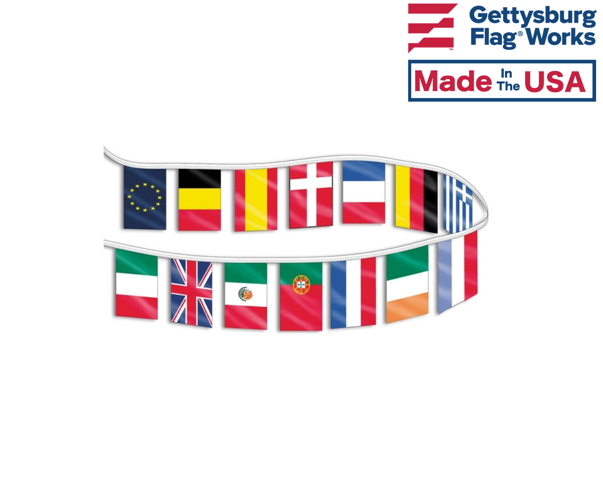 Plastic international flags sewn to a 30′ long string. Outdoor quality.