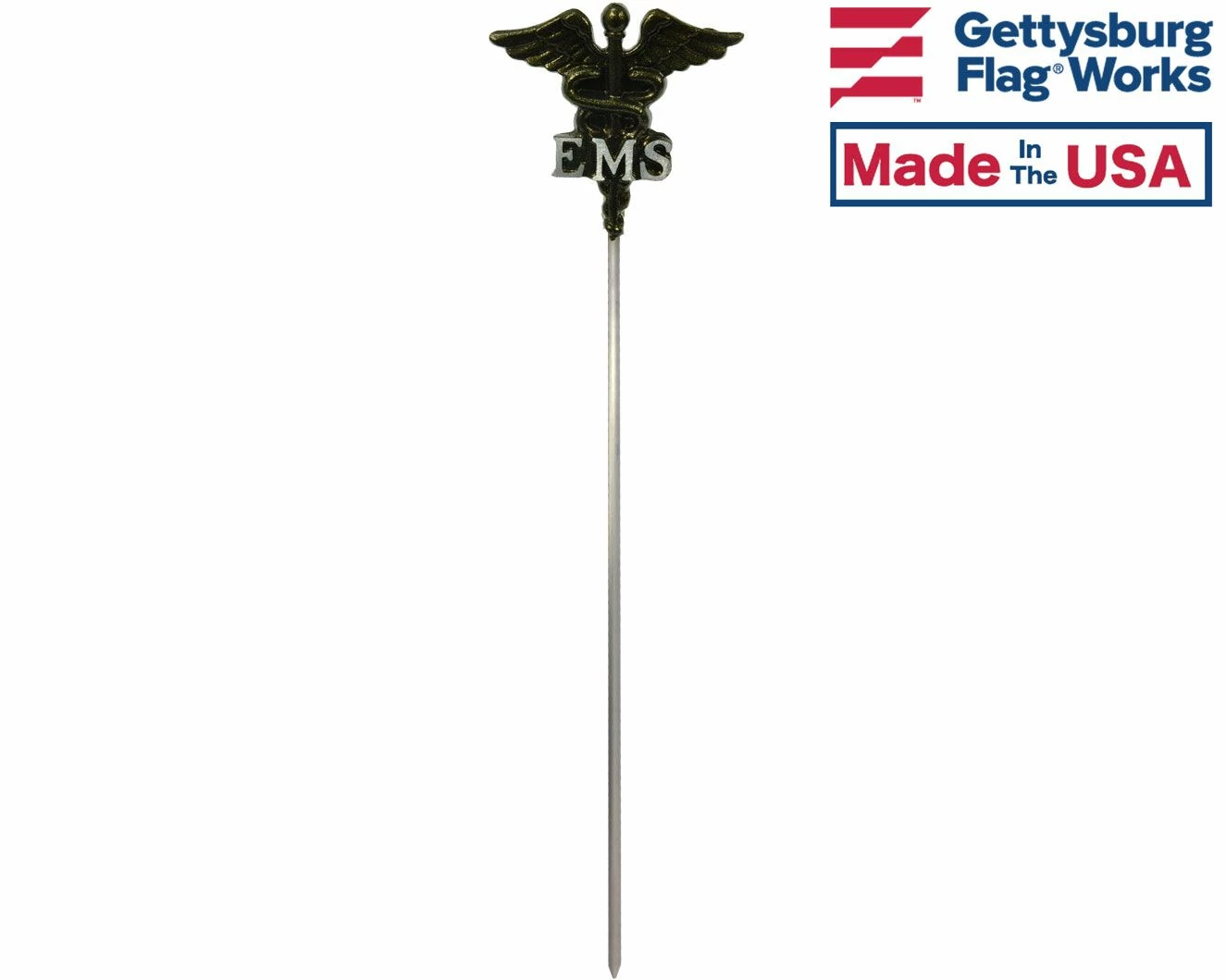 Bronze finished aluminum grave maker for members of the EMS. Design includes the medical staff and serpents. Official design mounted on a 21″ brass rod, holds one 12×18″ stick flag on a 3/8″ staff (flag not included).