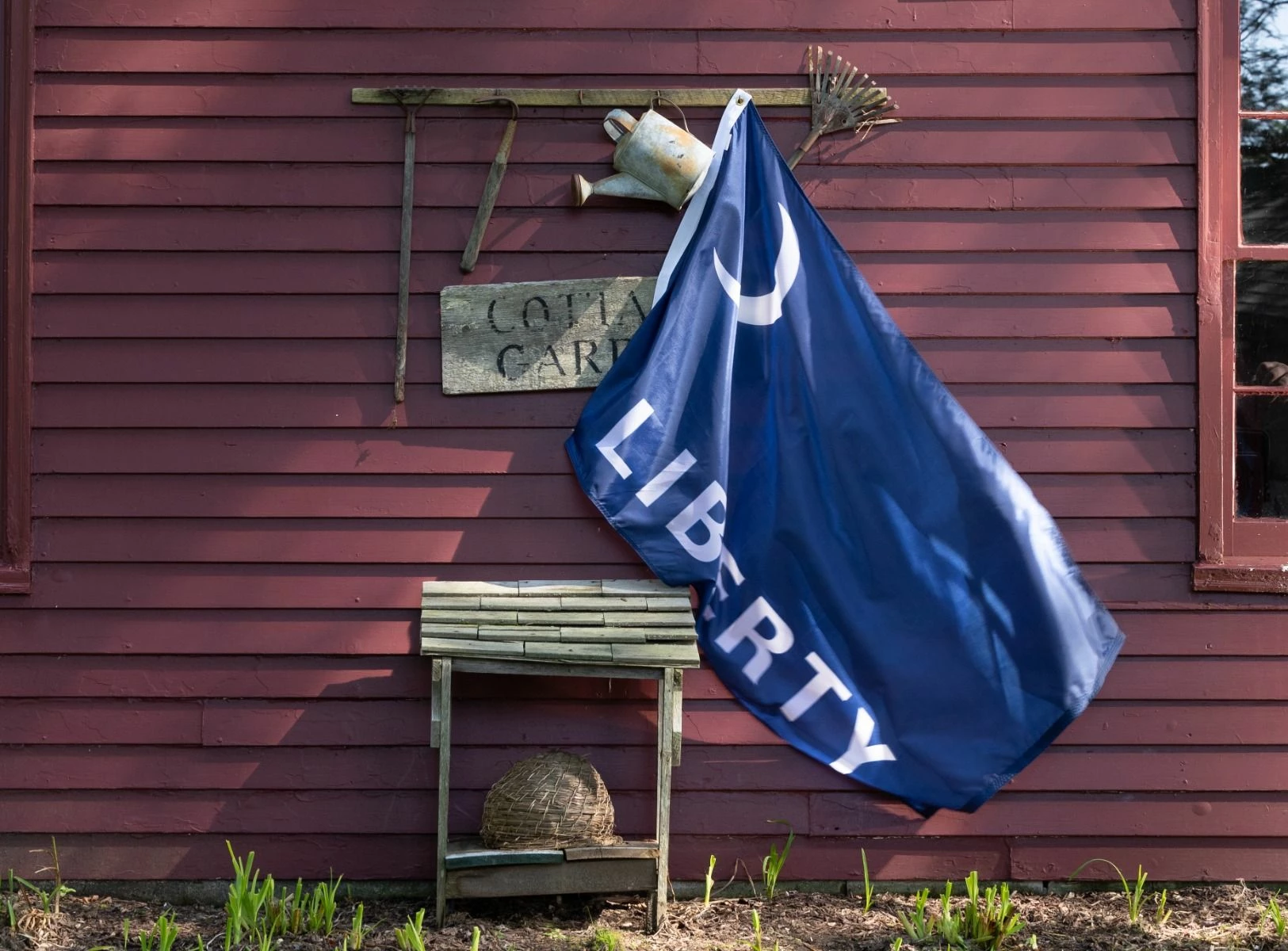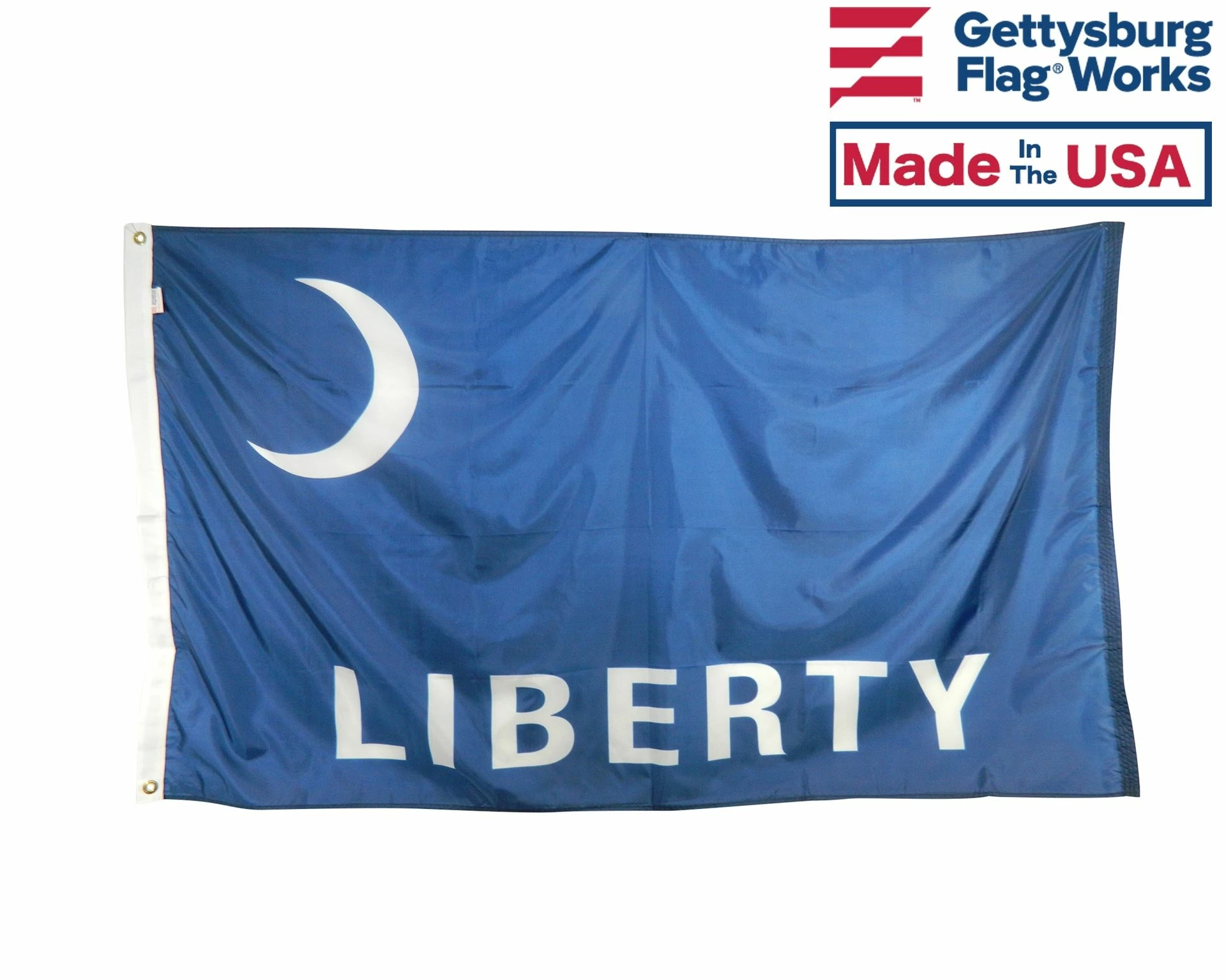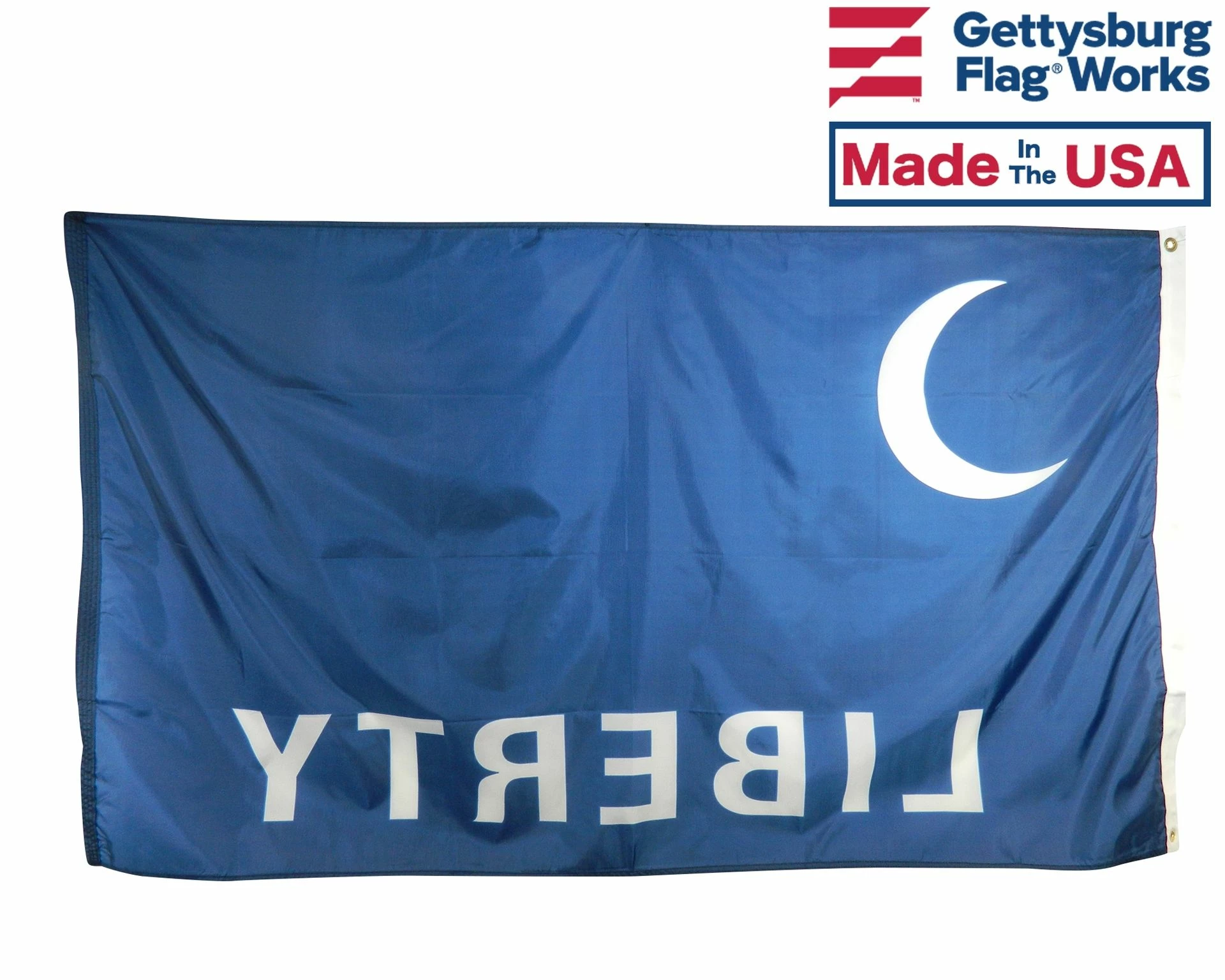 Classic Revolutionary War flag, designed in 1775 under the commission of Col. William Moultrie. This flag flew during the successful defense of Sullivan’s Island under bombardment by the British fleet off the coast of Charleston, SC in 1776. The design was the inspiration for,and is recognizable in, the design of the flag of the state of South Carolina.