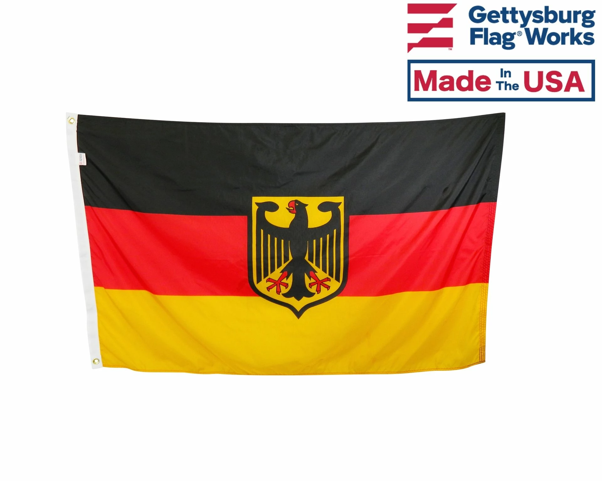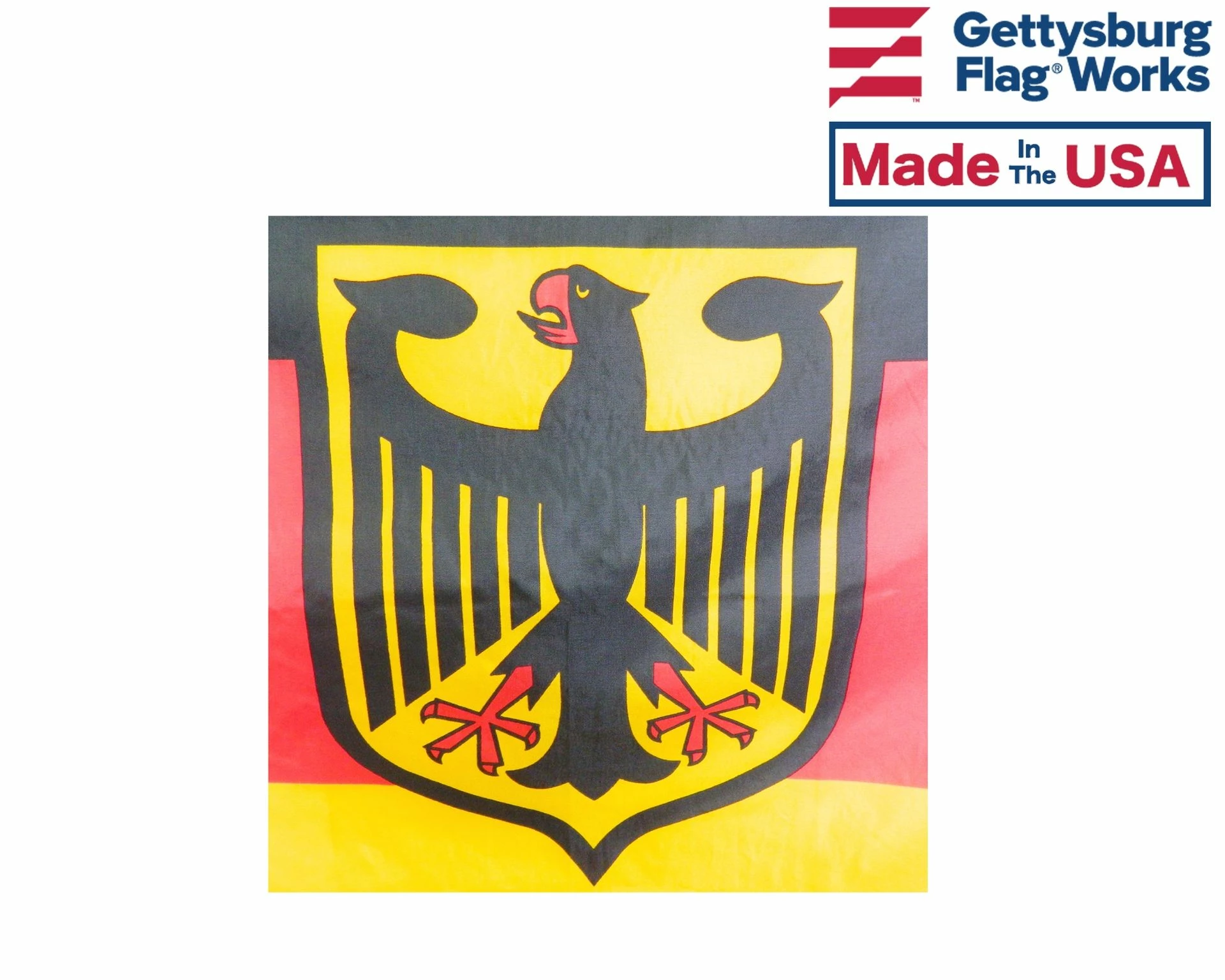 Tricolor Germany flag design with Bundesschild (eagle on shield) centered. This is the governmental version of the flag of Germany.