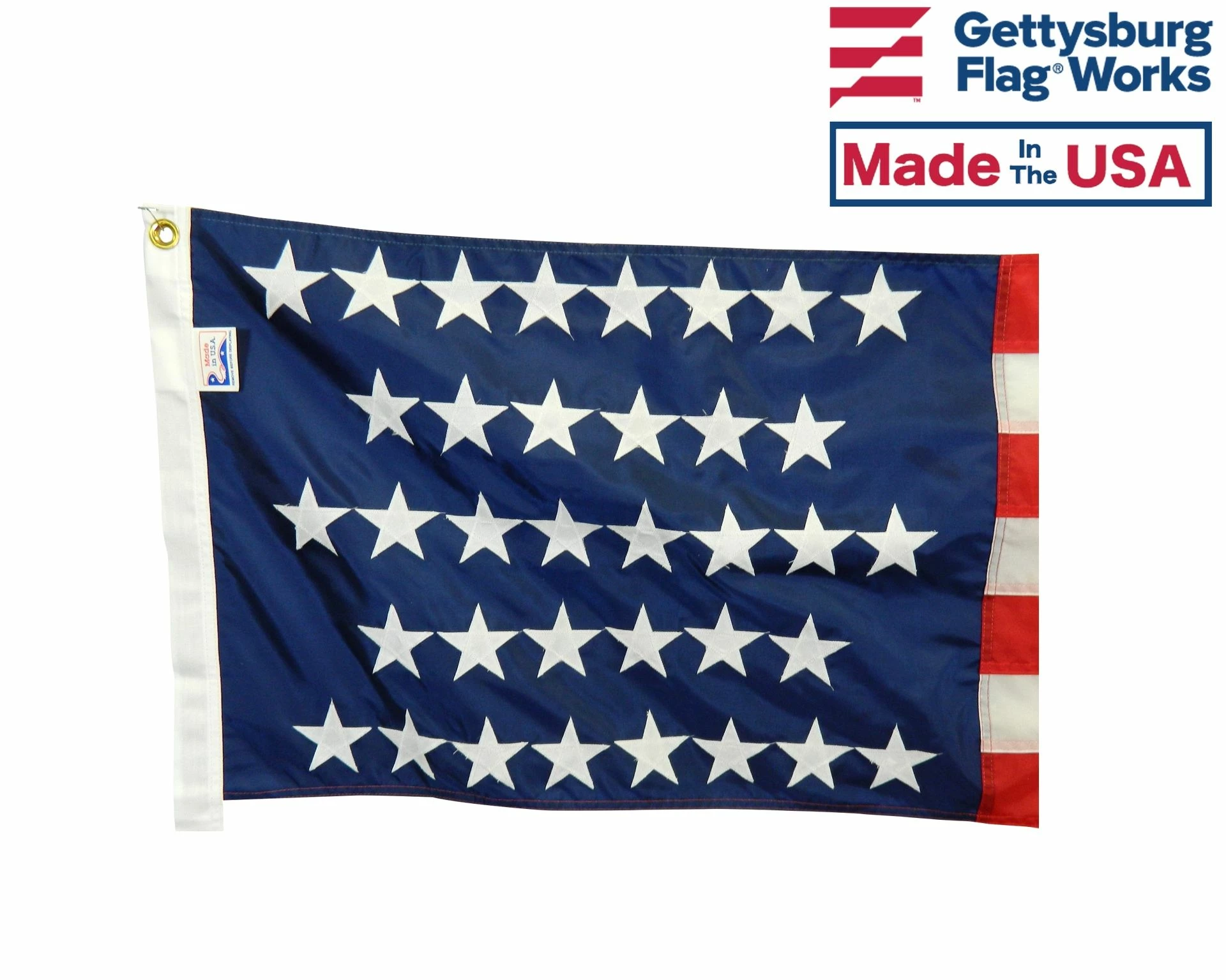 - Sewn stripes and applique stars, single-reverse with four rows reinforced stitching for durability