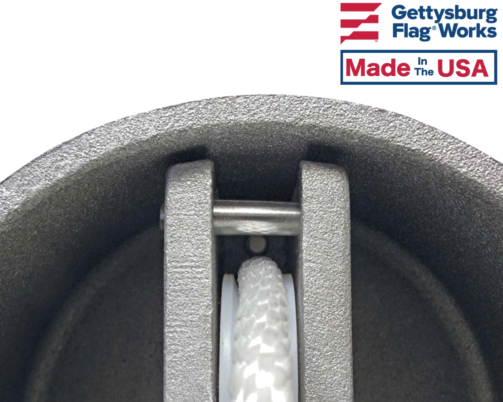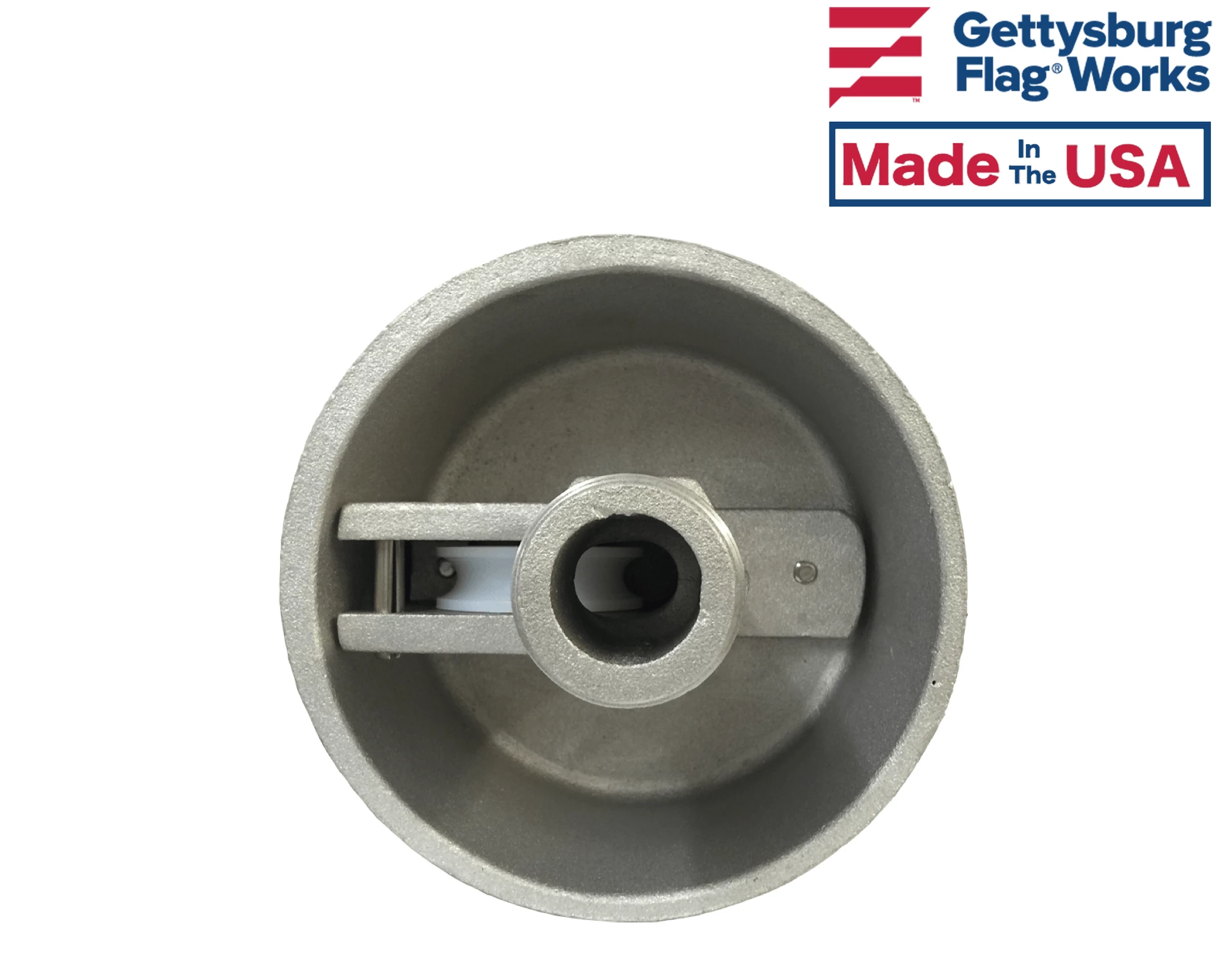Flagpole truck for rope style, internal halyard flagpoles. Stationary, single pulley style truck.