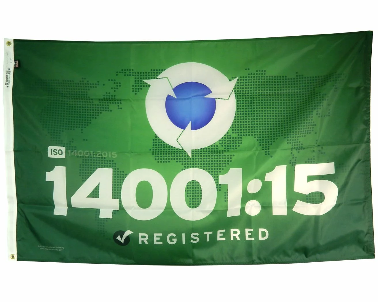 Durable digital print ISO 14001:2015 (Environmental Management) flag for indoor or outdoor use, with bright eye-catching colors.