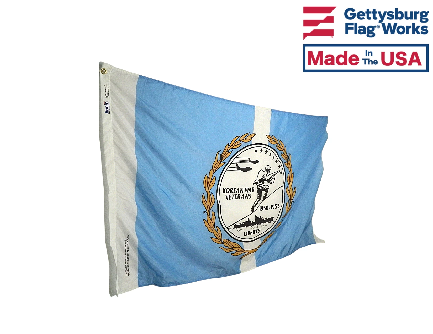 A flag designed as a tribute to Korean War Veterans. Flag is a durable printed nylon for indoor or outdoor display.