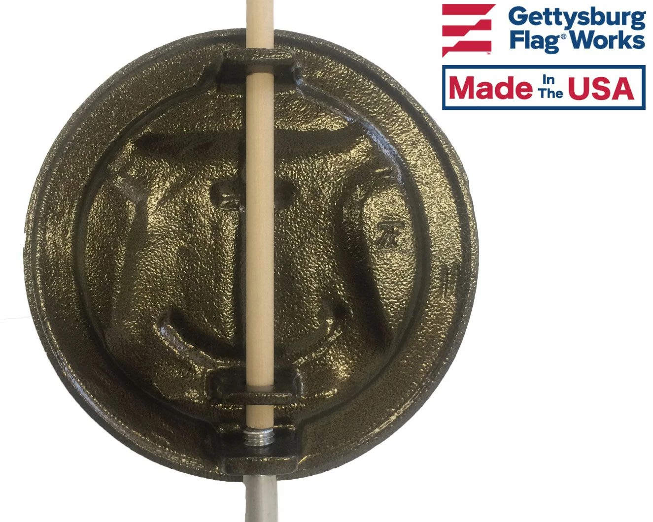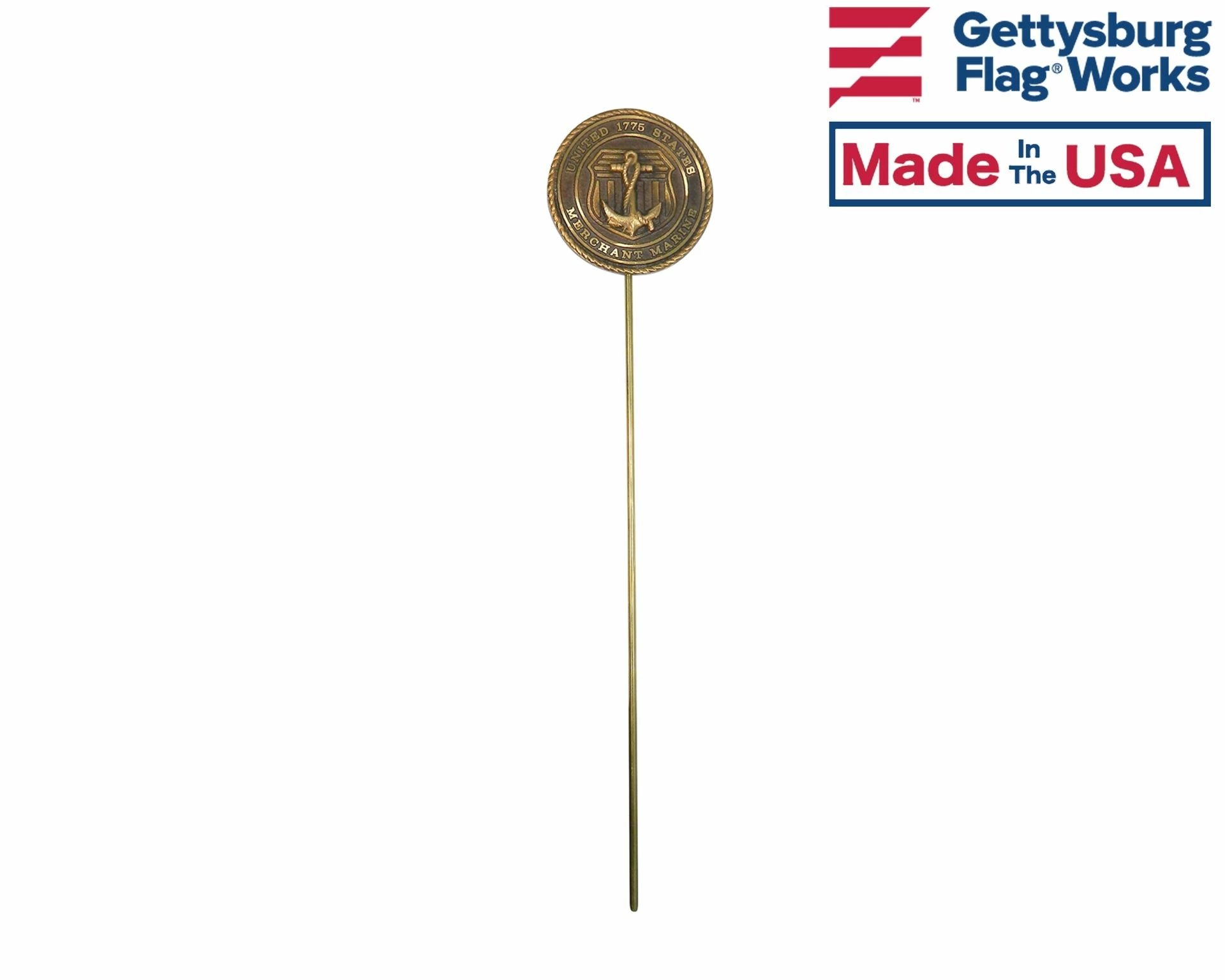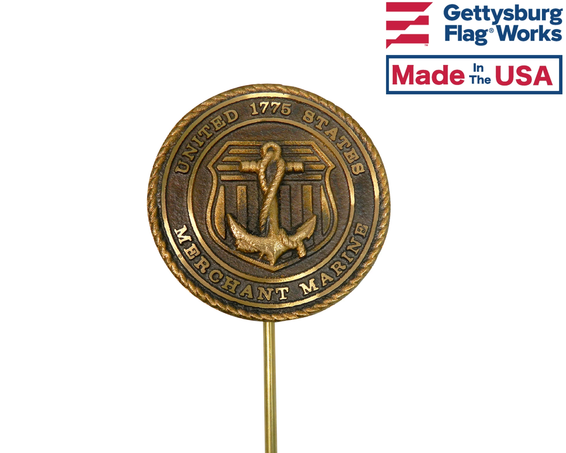 Veteran grave marker for members of the Merchant Marine. Official design mounted on 21″ brass rod, holds one 12×18″ stick flag on a 3/8″ staff. Choose between cast bronze or bronze-finished aluminum.