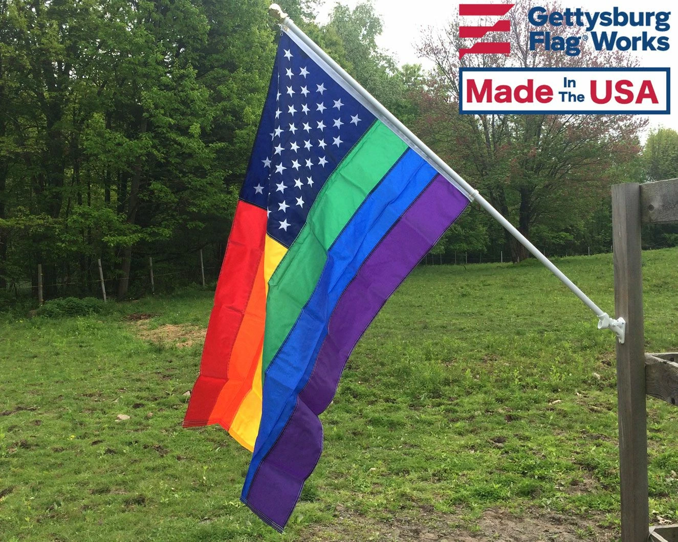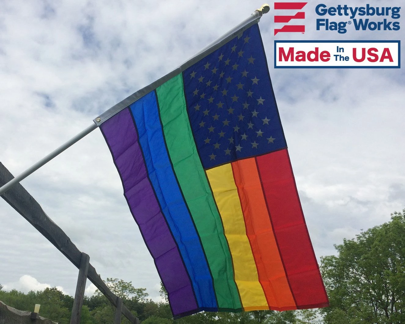 This flag has 50 stars to represent our 50 states, combined with the rainbow pride flag of the gay community. A contemporary blend of patriotism and diversity. High quality nylon with sewn stripes and embroidered stars. Flag has canvas header & brass grommets for mounting. Made in the USA.