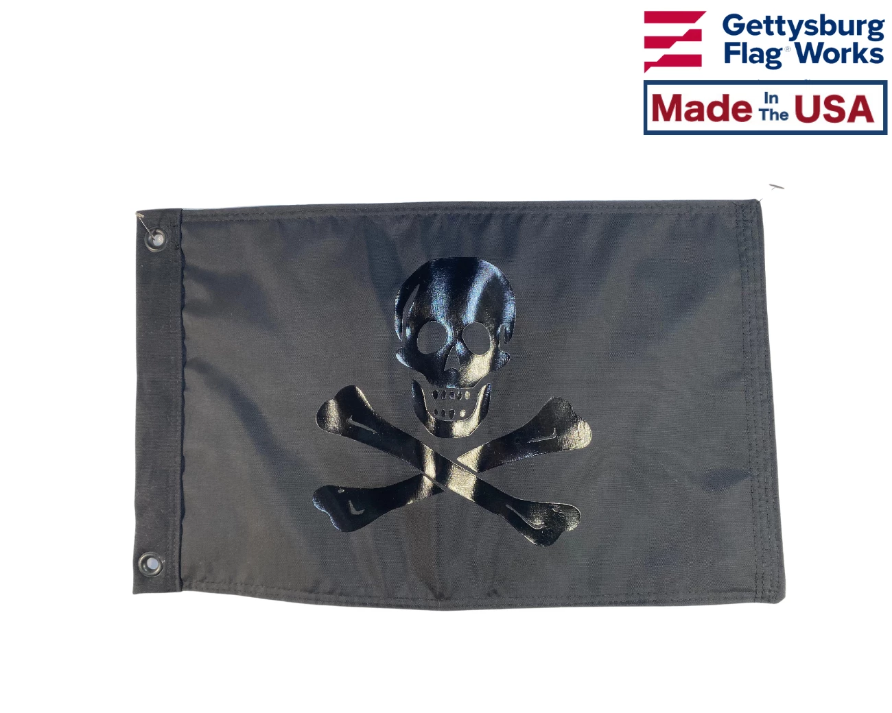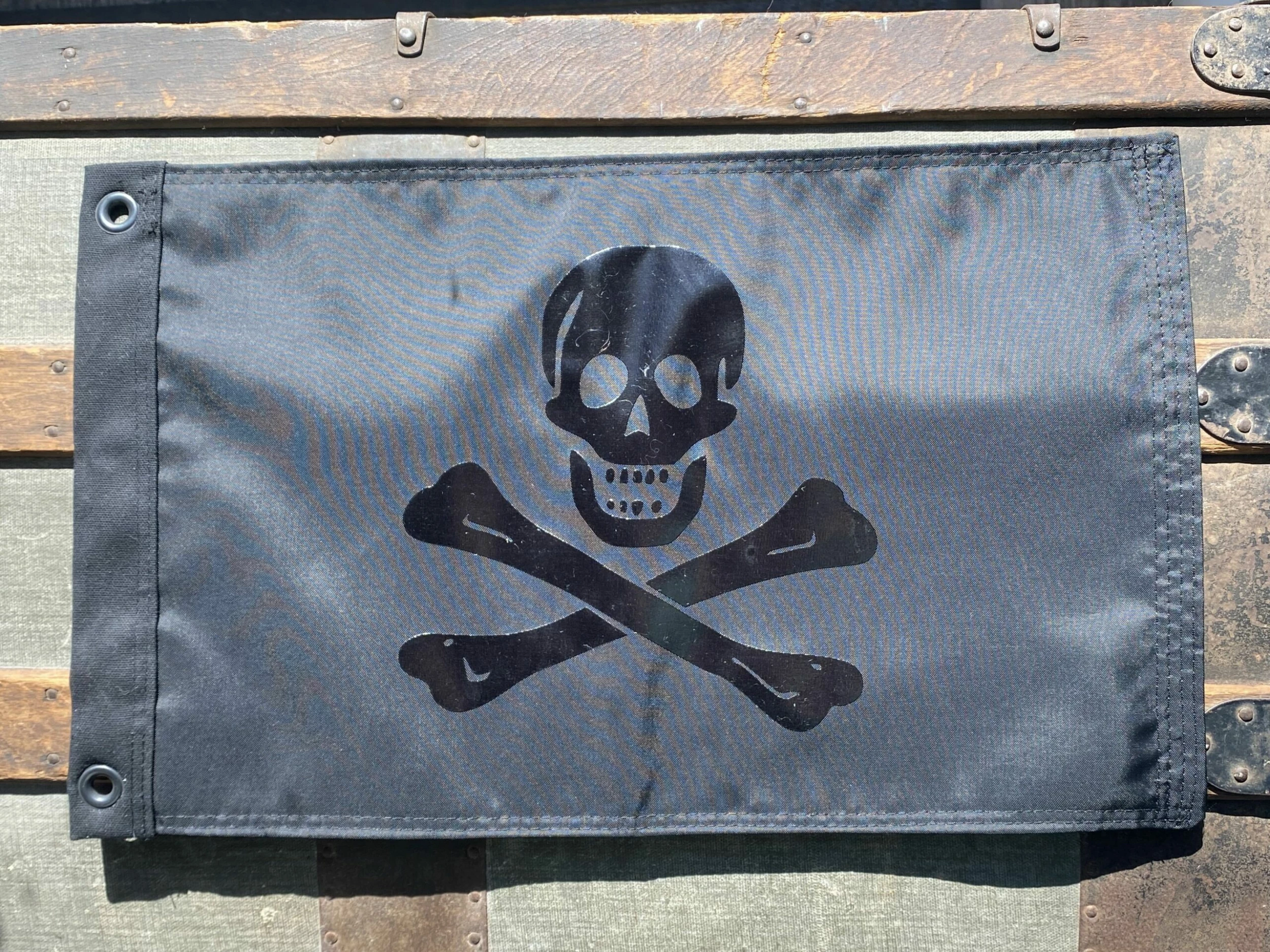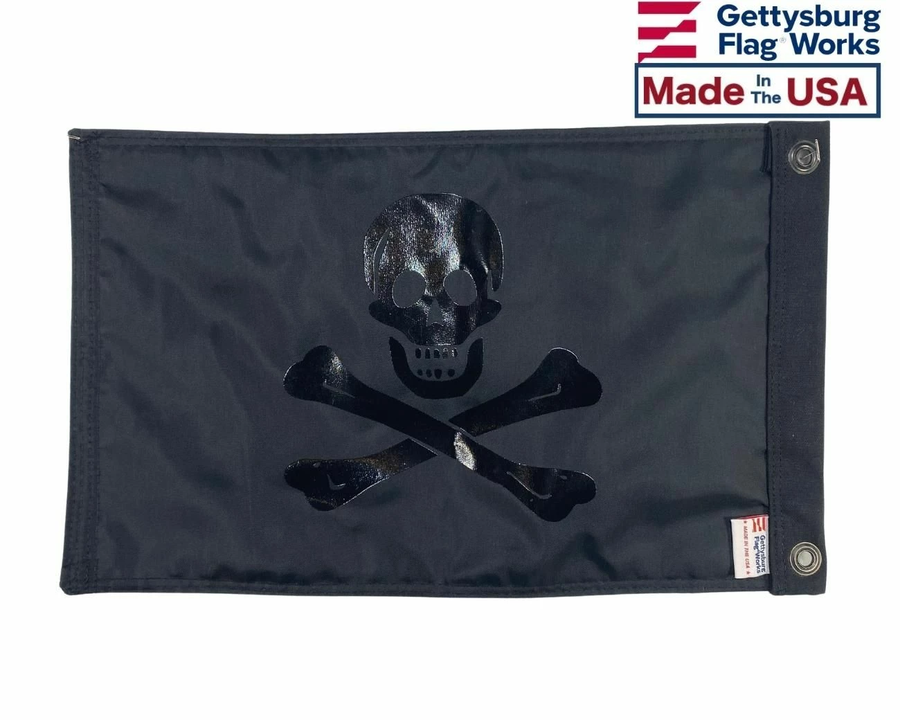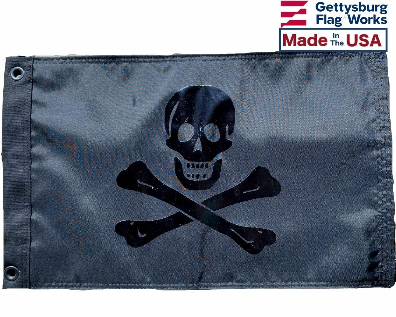 No Quarter Jolly Roger: Blackout Edition. Our all black pirate flag, which aside from being really cool looking, sends a message: traditionally all black flags signify no quarter will be given to enemies in the event of surrender. Black nylon, black grommets and black on black design, this flag is a standout on the water or on the dock.