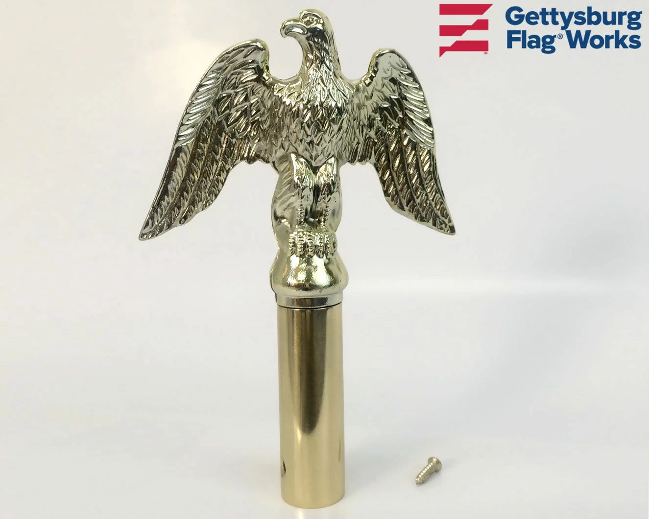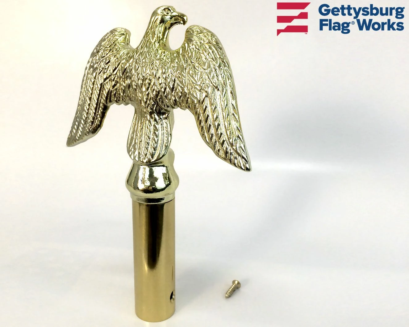 The eagle is the traditional finial for the American flag. This ornament is made to highlight a beautiful flag and match the gold color found in brass hardware or a gold finished pole. The perched eagle is available in gold finished aluminum or plastic and various sizes.