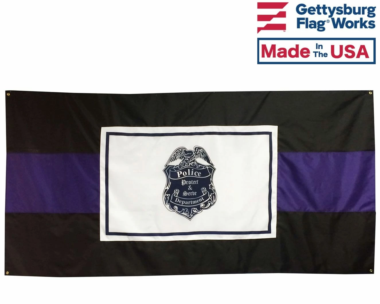Honor a fallen officer with this beautiful handcrafted casket drape. Each drape is made using a symbolic shield with the words “Protect and Serve” at the center. This funeral drape is 5′ wide by 9.5′ long, just like a traditional American flag used during a funeral. Our casket drapes are sewn nylon with a grommet in each corner for securing.