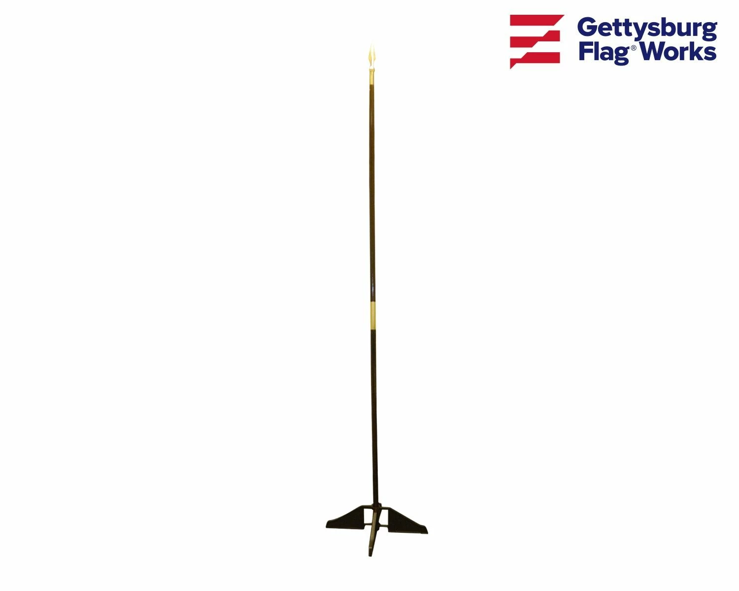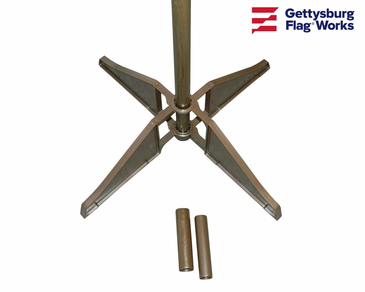 The portable flag stand is made of a strong, durable polymer plastic. When completely folded this stand measures 24″ x 2.125″. Color is rich dark brown to compliment any decor. Supplied with adapter sleeves to accommodate various pole diameters.
