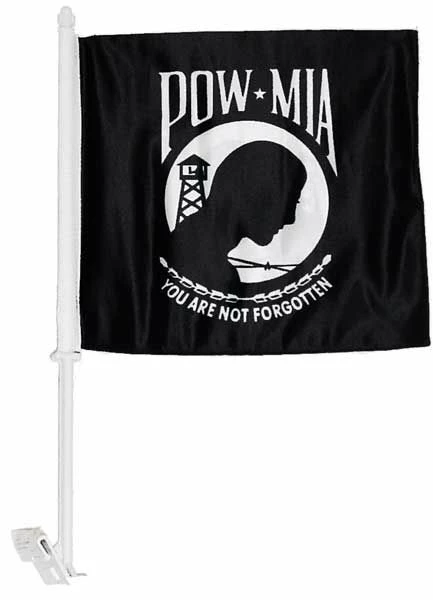 Double thickness, durable POW/MIA flag for mounting to the window of your car or truck. Digitally printed polyester on a plastic staff.