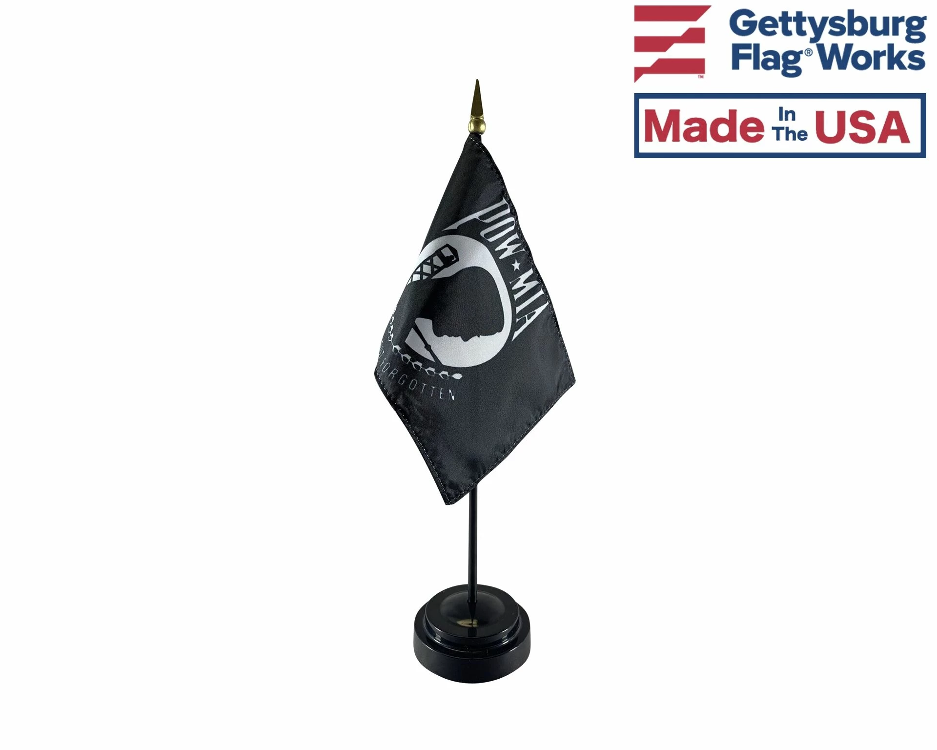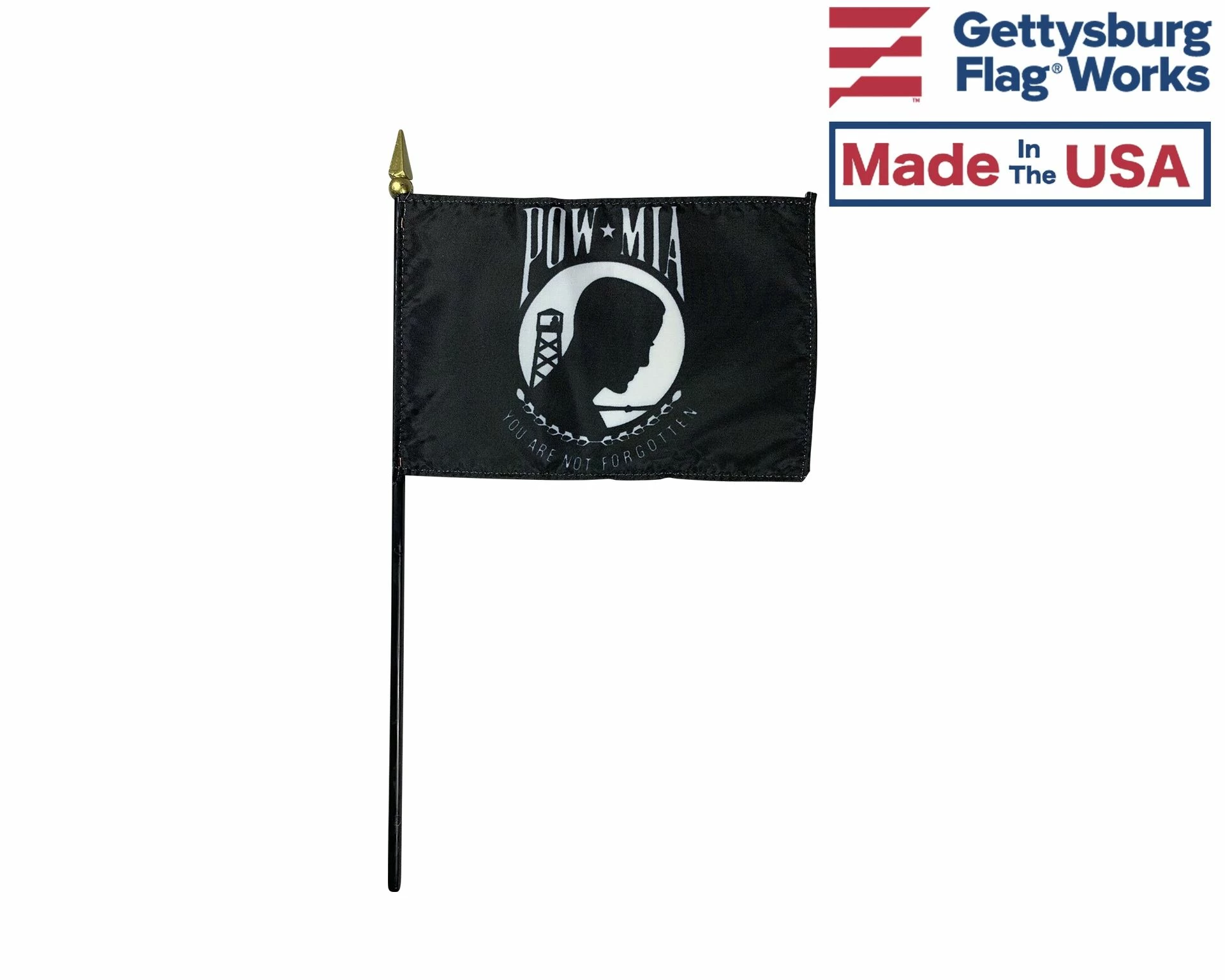 POW/MIA flags mounted to wooden or plastic staffs. “You are not forgotten”