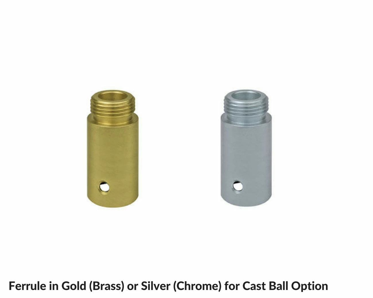- Available in cast metal with gold brass finish & chrome silver finish (with and without ferrule) or light weight gold anodized aluminum (with ferrule)