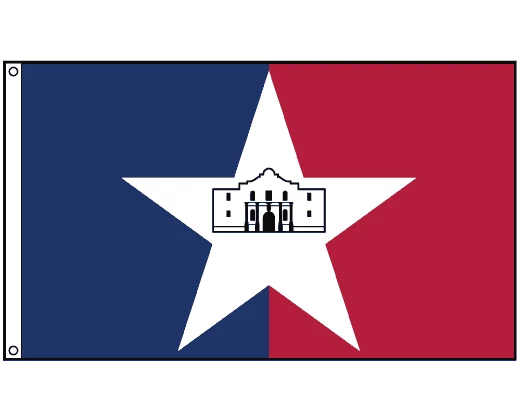 The San Antonio city flag depicts an outline view of the Alamo on a large white star, centered on a red and blue vertically striped flag.