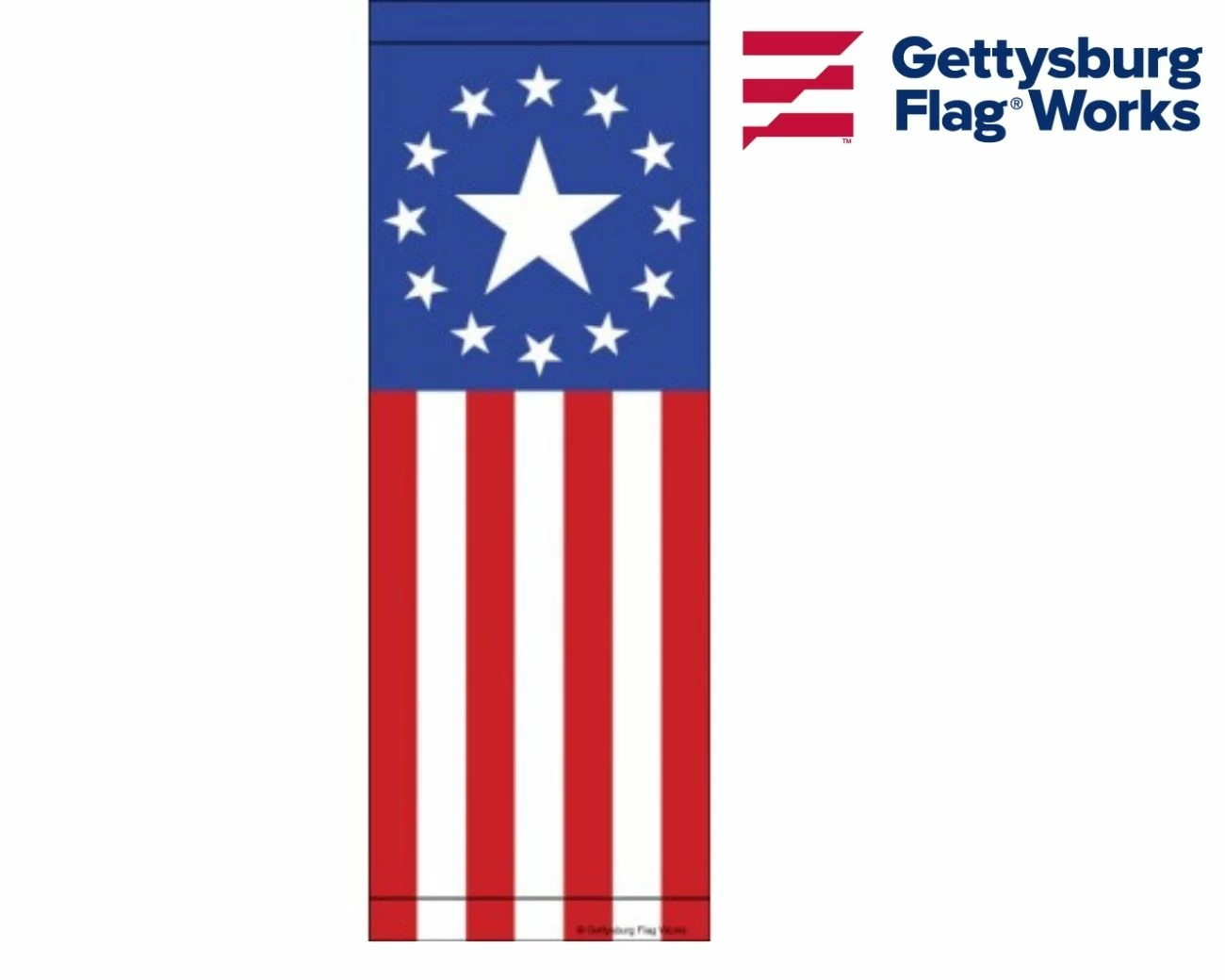 Stars and stripes with a patriotic Betsy Ross type design. Typically these banners are mounted on light poles, telephone poles, or city street lamps. They can also be mounted to the wall of a building, or on durable columns.