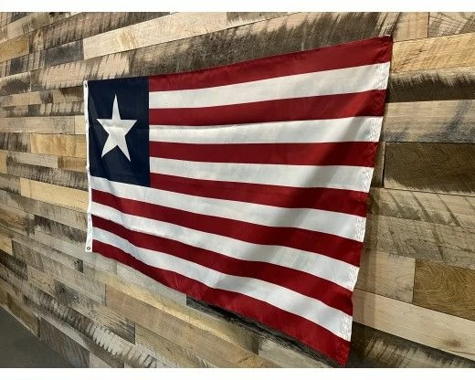 Historical flag of the Navy of the Republic of Texas. Flown during conflicts with Mexico on Texas Naval vessels for a little over a decade until the Texas Navy merged with the US Navy in 1846. Similar to the design of the Liberian flag of Africa, with the Texas Naval flag having a larger star and 13 stripes rather than the 11 on the Liberian flag.