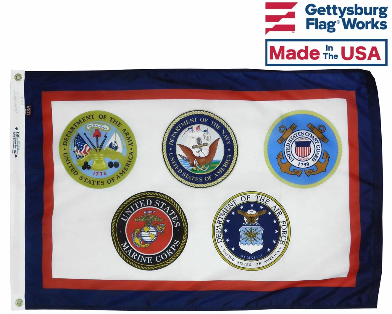 High quality outdoor flag with each of the 5 military branch seals printed on a white background with border. A beautiful flag to fly on military holidays like Veterans day or Memorial Day, honoring all official branches of service!