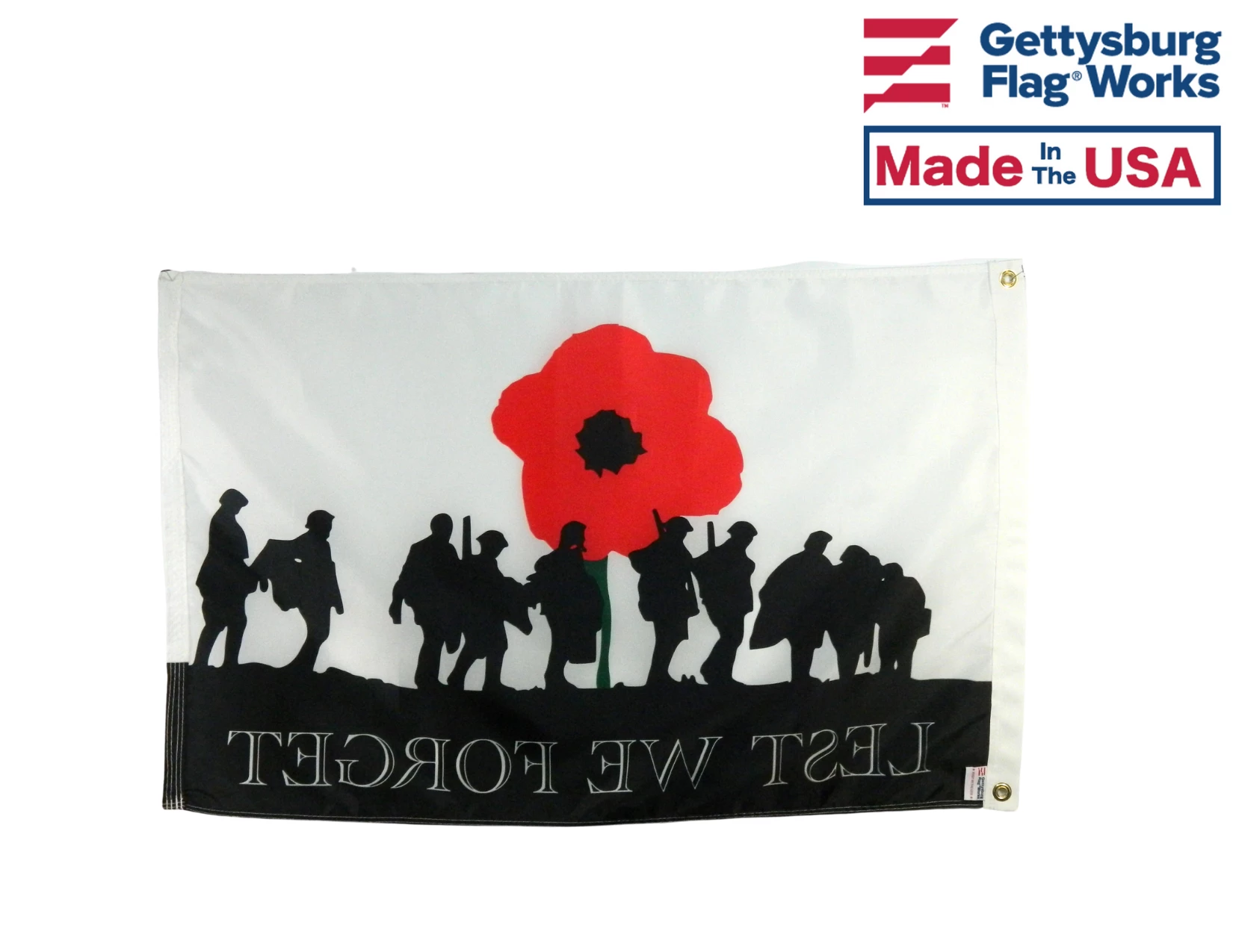 The war to end all wars, a horrible, brutal conflict decided in the fields of Europe over 100 years ago. This commemorative flag features outlines of the soldiers who bravely fought and sacrificed during the First Great War. The poppy is a long established symbol of the First World War, particularly in the United Kingdom. This flag honors and remembers those brave men who fought during this first world conflict, “Lest we forget”.