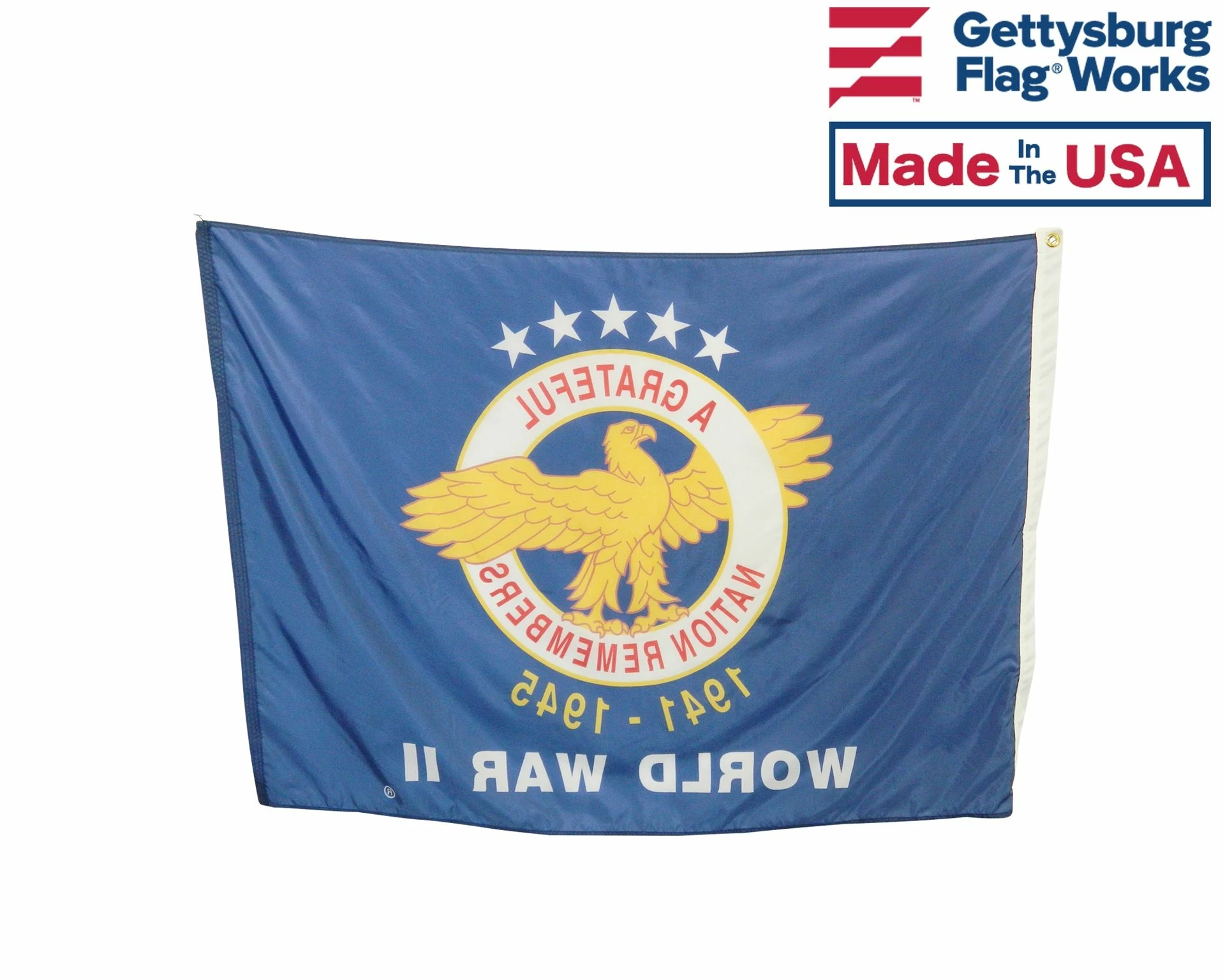 WWII Commemorative Flag to honor the sacrifices of the Greatest Generation in combat. Features the classic “Ruptured Duck” Emblem.